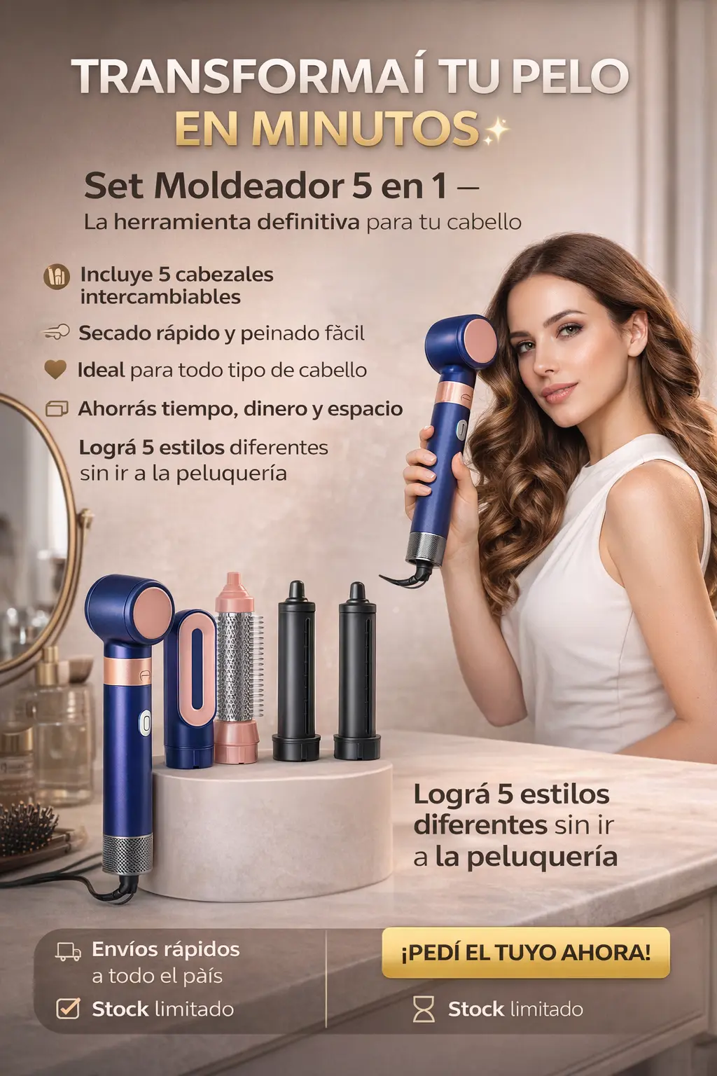 - 5 accesorios intercambiables: cepillo recto, cepillo brushing, buclera hacia la derecha y hacia la izquierda, pre moldeado. (Ninguno es giratorio)
